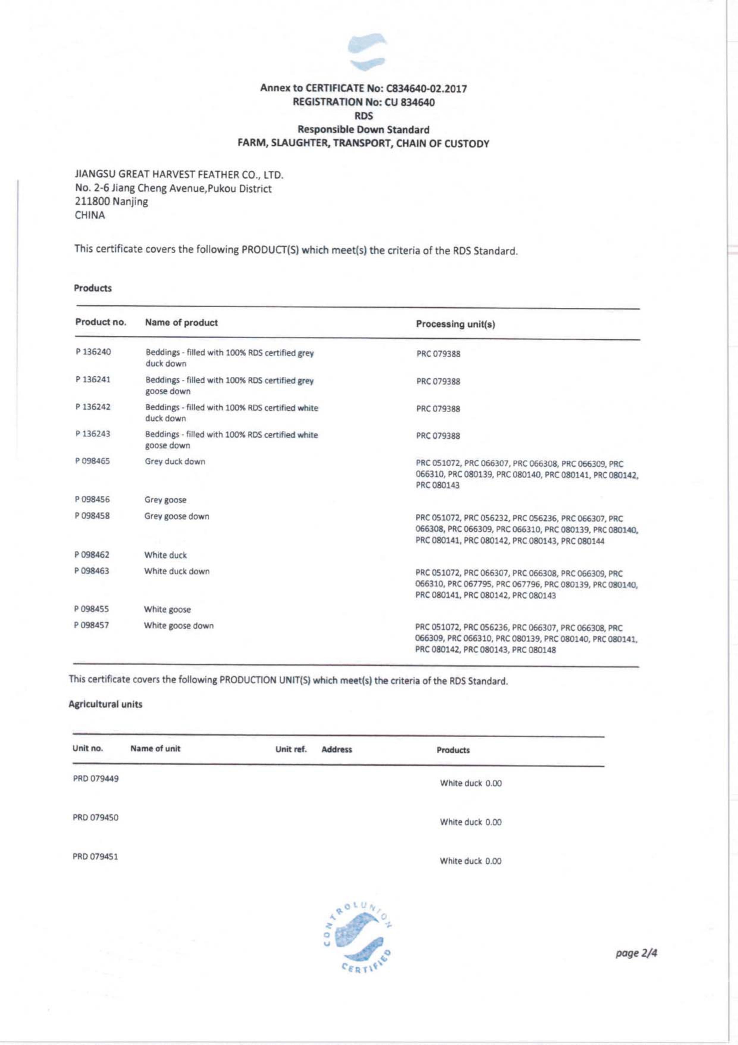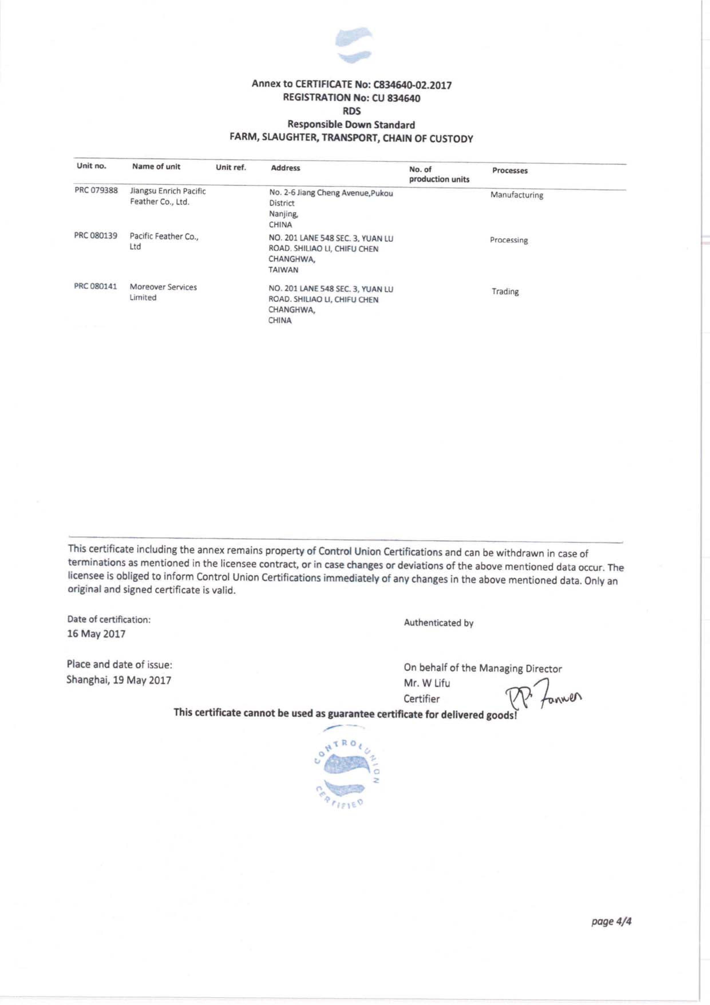公司長久以來支持綠色環保與人道的生產理念,並努力將此理念落實在產品中,致力以人道的方式對待所有動物,因此公司在 2016 年時通過RDS認證。 Responsible Down Standard 負責任羽絨標準簡稱 RDS,是由 The North Face 與管制聯盟認證 (Control Union Certifications) 和 TE 合作開發,旨在確保羽絨供應鏈的所有動物都能受到道德對待。並確保羽絨來源來自非虐殺、強迫餵食或活體拔毛的動物。我司取得 RDS 認證後目前已可依照認證項目提供 RDS 證書,並持續增加更多認證項目。