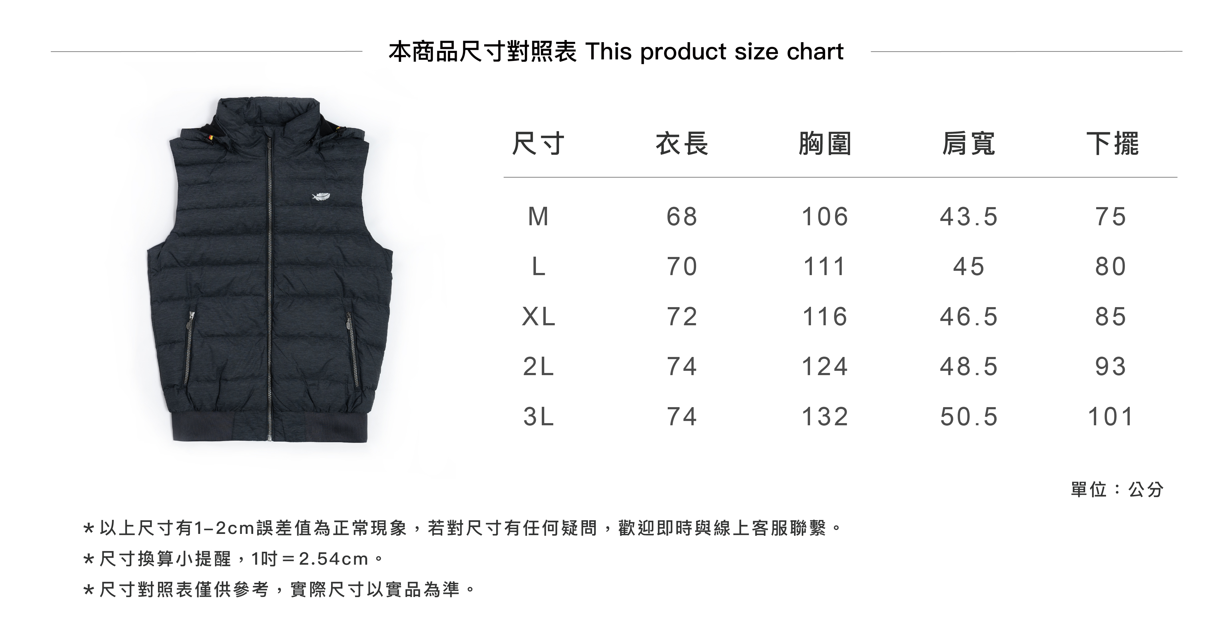 | 充絨量 | M | L | XL | 2L | 3L |