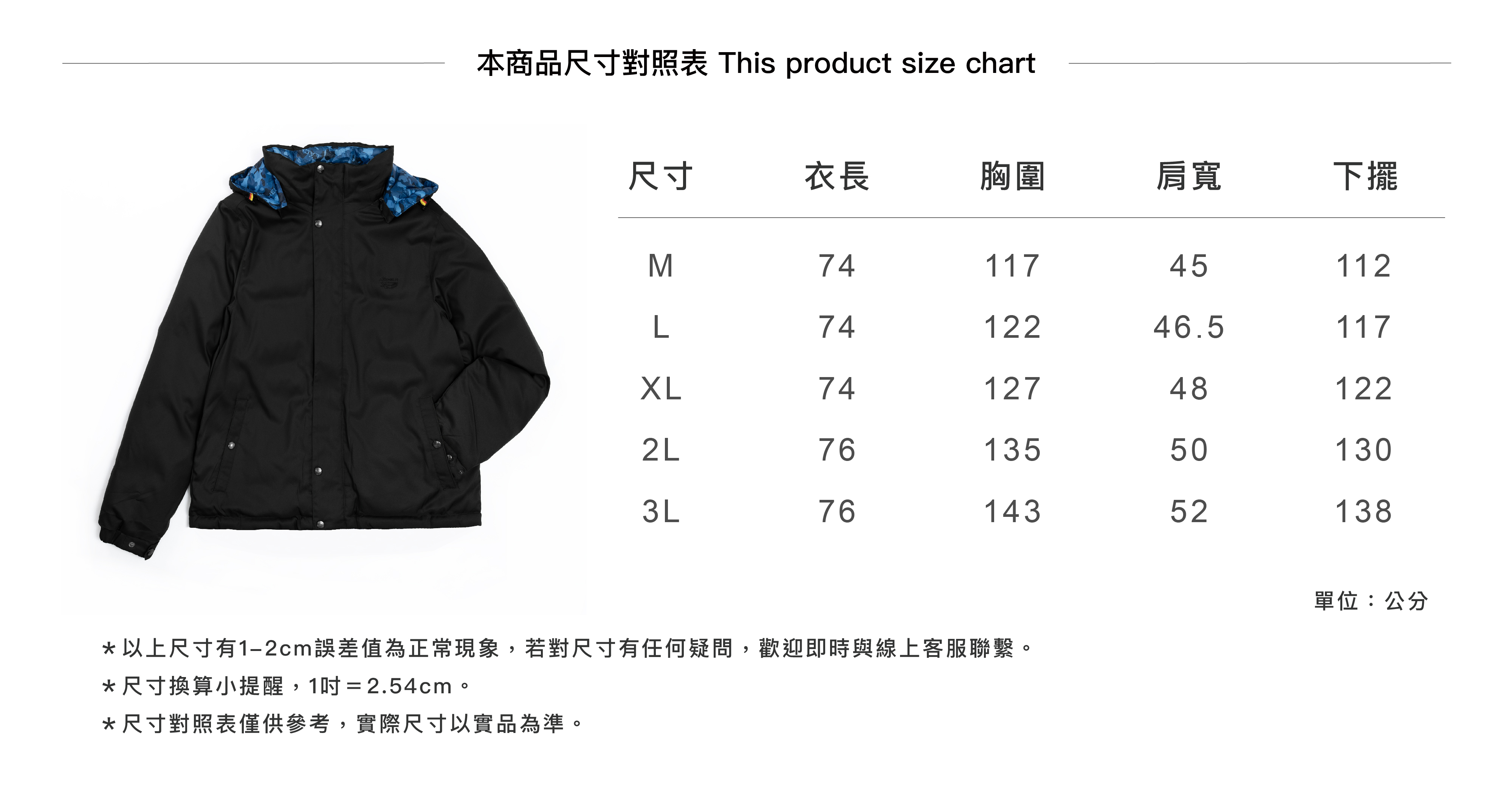 | 充絨量 | M | L | XL | 2L | 3L |